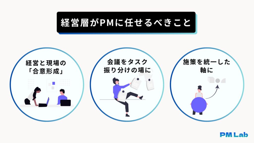 ではそのPMは、経営層が現場のタスクを手放し本来の「判断と戦略」に集中するために、何をしていけば良いでしょうか?
