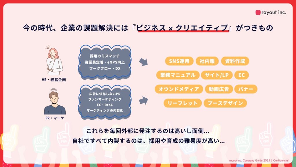 近年、ステークホルダーごとの最適なコミュニケーションデザインの重要性が高まり、PRやクリエイティブの活用は採用・人事・マーケティング・経営企画など、あらゆる部署の課題解決に欠かせない存在となっています。